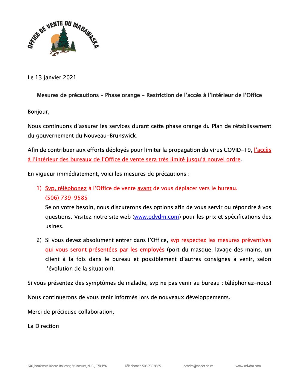 L'Office de vente du Madawaska continue d’assurer les services durant cette phase orange du Plan de rétablissement du gouvernement du Nouveau-Brunswick.